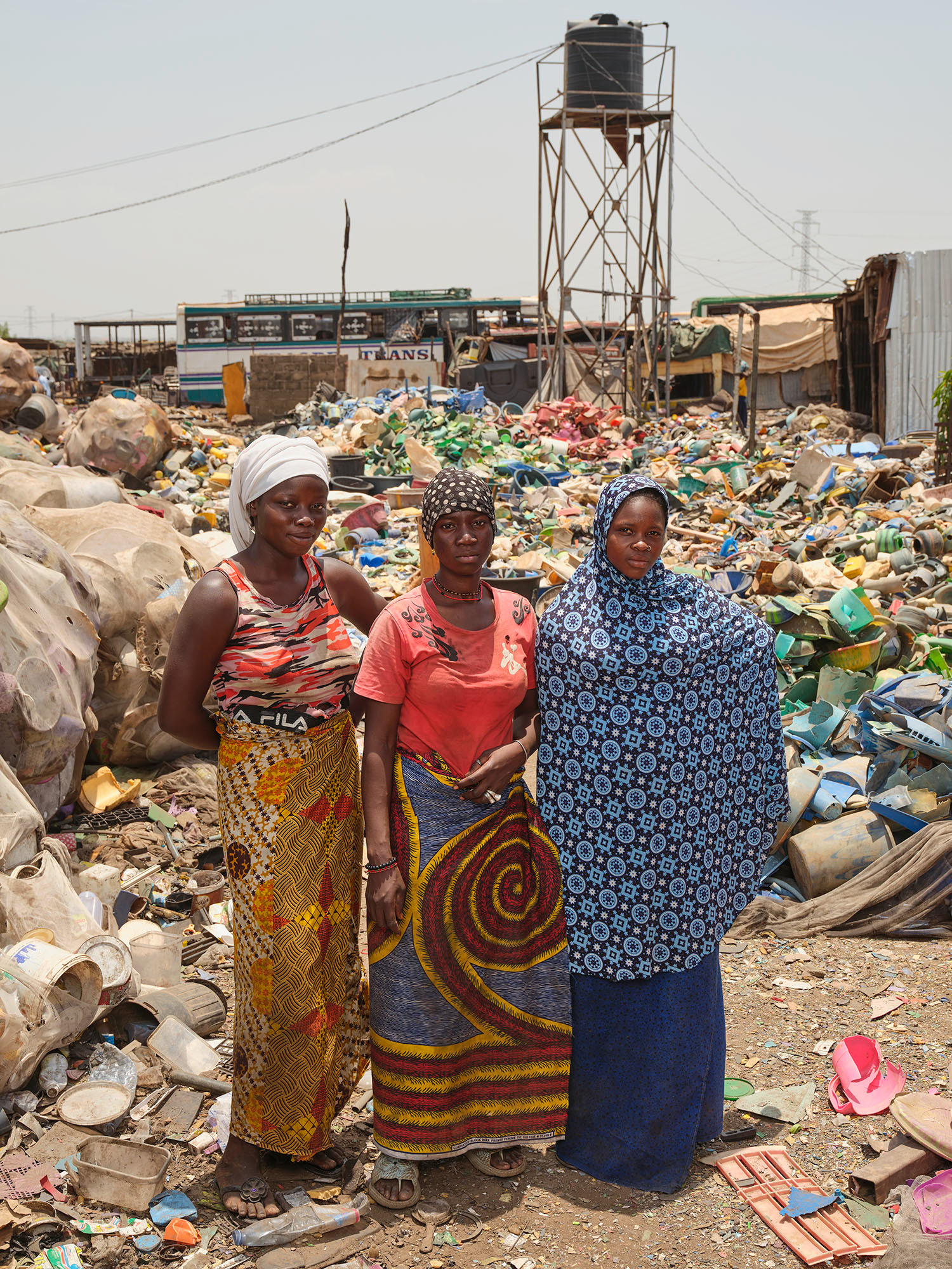 Hawa, Batoma, and Fati live in the displacement site of Faladié, located on top of a waste landfill. They collect and sort plastic waste by color. Bamako, May 2025